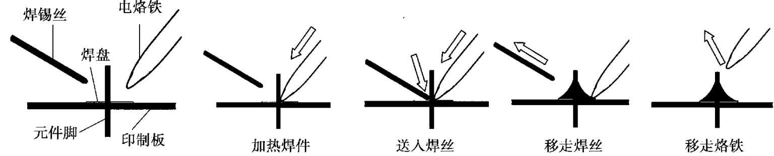 ④移走烙铁。从右斜上方向移开烙铁,结束焊接。