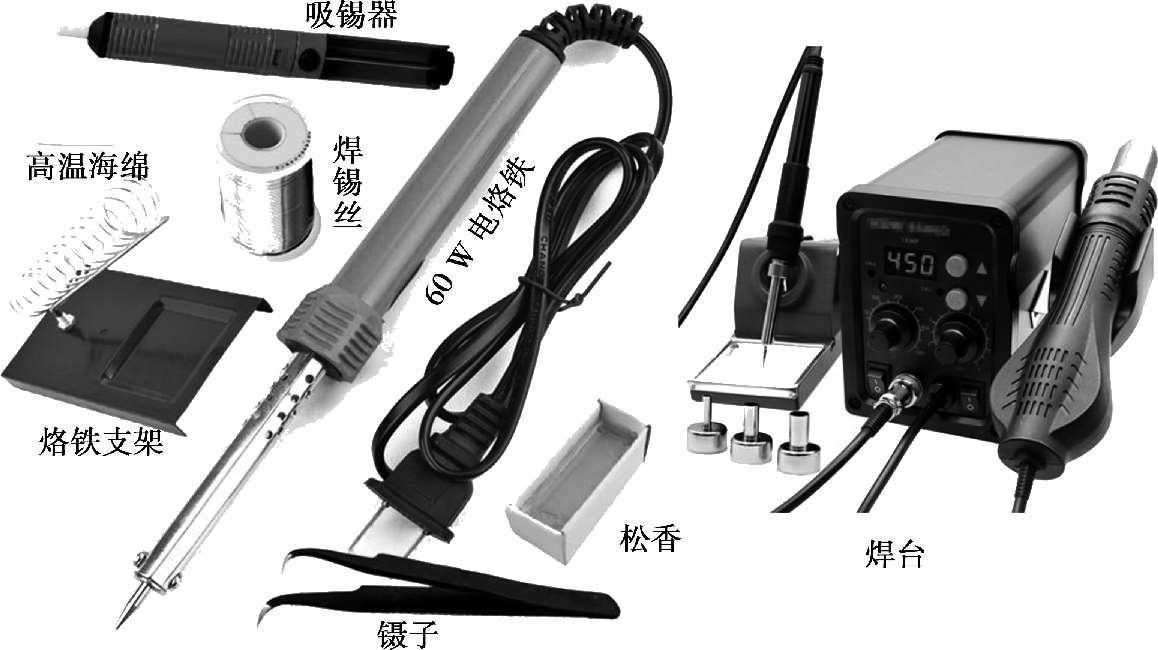 焊接电子元件常用的工具材料有电烙铁、镊子、锡焊丝、助焊剂(松香)等,如图1-49所示。电烙铁有不同功率,可以选择25~60 W的,焊台可选择可调温并带热风枪的,最适合的焊接温度为280℃左右,焊锡丝可以选择免清洗、直径为0.8 mm的。
