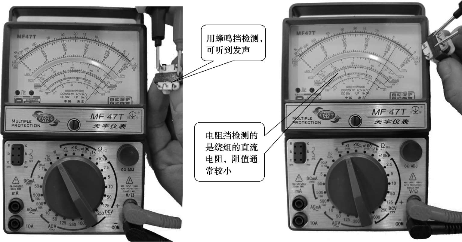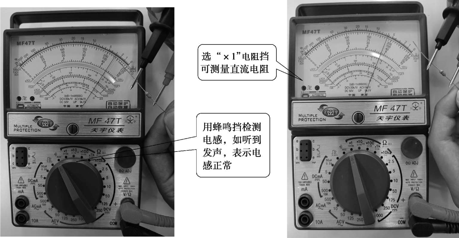 电感和变压器的绕组均由线圈构成,电感只有一组线圈,而变压器通常都有初级线圈和次级线圈,只要用万用表电阻挡的“× 1”挡或蜂鸣挡测量电路的通断情况,就能检测其好坏。如果阻值较小(通常几百欧以下)或蜂鸣挡发声,说明电感或绕组正常导通,如果为无穷大或蜂鸣挡不发声,说明绕组开路。