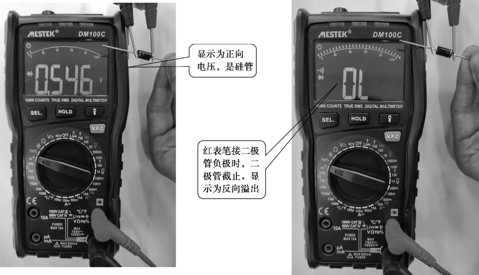 数字式万用表测量二极管时,直接选用“二极管”挡进行检测。数字式万用表的红表笔接二极管正极,黑表笔接二极管负极时,可以直接测量二极管的导通电压,从导通电压可以知道二极管的构成材料(如果导通电压是0.2~0.3 V,材料是锗;如果导通电压是0.5~0.7 V,材料是硅)。当数字式万用表的红表笔接二极管负极,黑表笔接二极管正极时,二极管截止,数字式万用表显示溢出,如图1-42所示。