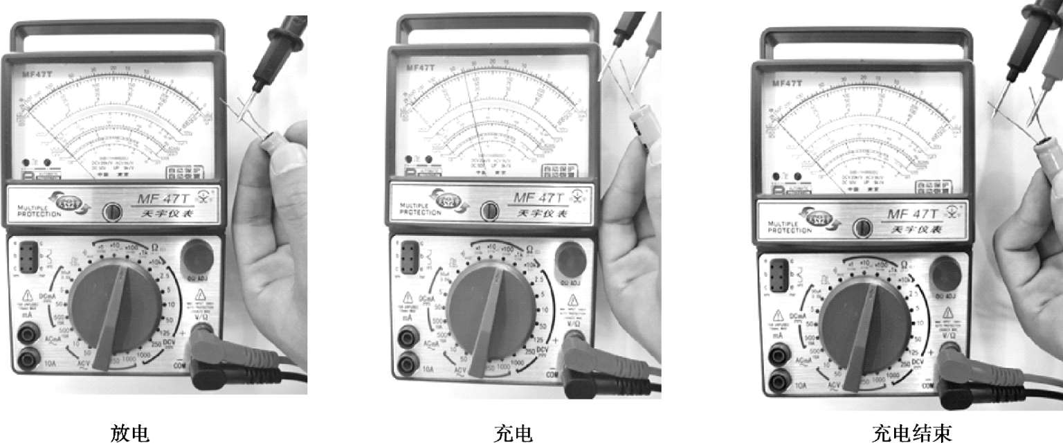 用指针式万用表的电阻挡通常只能初步估测电容器的好坏,检测电容是否漏电。测电解电容时,测量前一般先短接放电,然后根据容量选择量程(一般几微法数量级的选择“ R × 100”挡,几百微法数量级的选择“ R ×10”挡),接下来把红表笔接电容器的负极,黑表笔接正极,观察指针转动情况,如果万用表指针首先向右摆动,然后又能恢复到左边无穷大刻度线,说明电容器是好的,不漏电;如果指针指向右侧的零刻度线,或长时间不回到左边无穷大刻度线,都说明电容漏电或击穿。其测试过程如图1-36所示。
