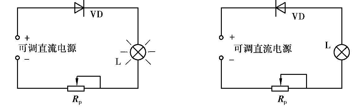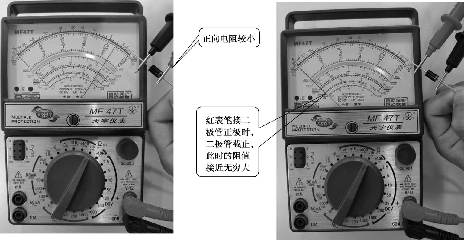 指针式万用表测量二极管时,一般选用万用表电阻挡的“× 1 k”挡进行检测。由于在万用表内部,黑表笔接电池正极,是高电位,当黑表笔接二极管正极,红表笔接二极管负极时,二极管导通,此时阻值较小。当交换表笔,红表笔接二极管正极,黑表笔接二极管负极时,二极管截止,阻值接近无穷大,如图1-41所示。