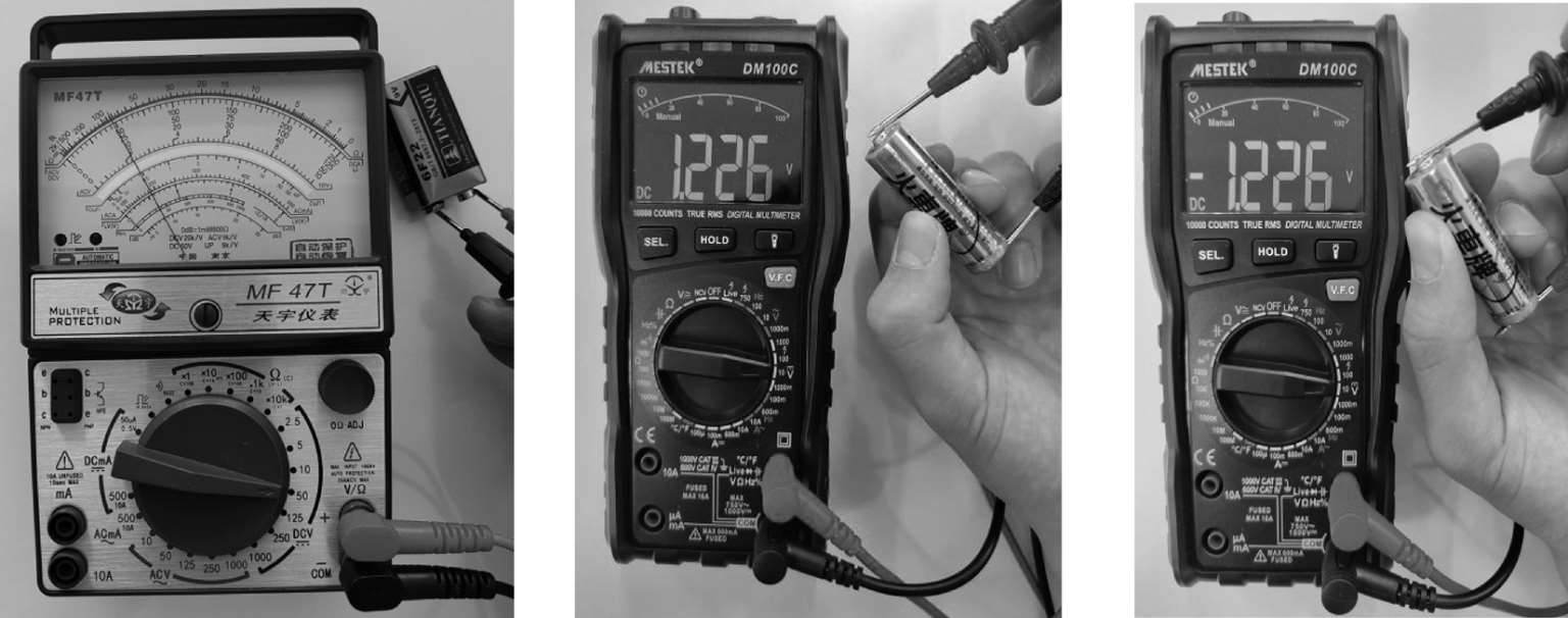 指针式万用表测量直流电压时,首先调节转换开关选择合适的量程(转换开关对应的为最大量程),然后红表笔接电源的正极或高电位端,黑表笔接电源的负极或低电位端测量。数字式万用表测量电压时无需考虑表笔的正负极,只需选择合适量程(量程不小于被测量的电压)即可,如图1-30所示。