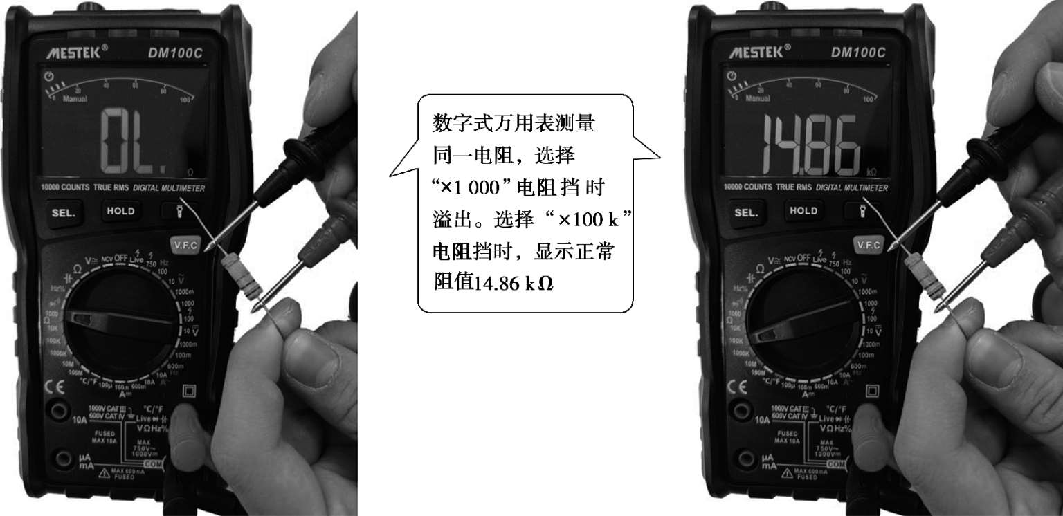 指针式万用表测量电阻时,尽量使指针指到刻度的中部或偏右。数字式万用表测电阻时,选择的量程要略大于被测物的参数,否则读数溢出,不能显示,如图1-32所示。