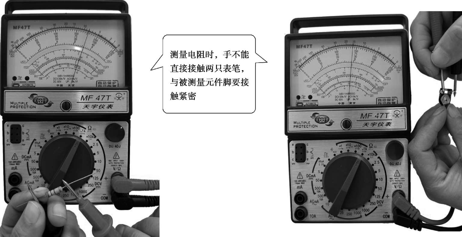 ③测量:红、黑表笔与被测元件脚接触良好后进行测量,如图1-34所示。