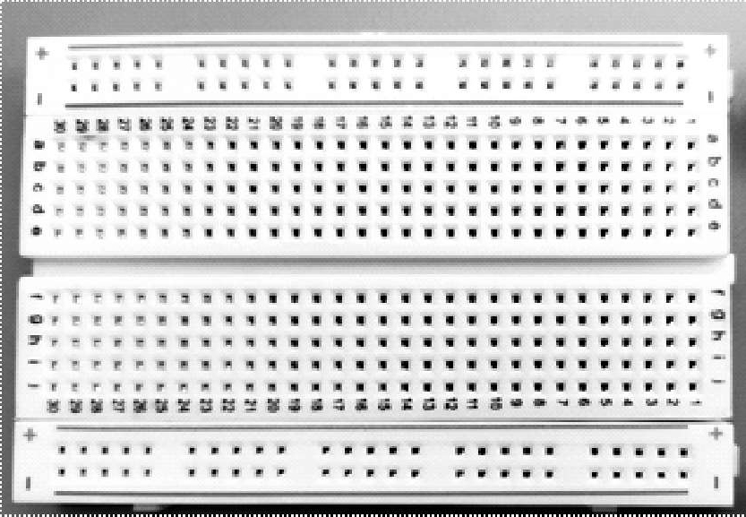 在检测电路性能的实验中,通常会用到直流稳压电源和面包板。直流稳压电源可提供实验需要的电压和电流,而面包板方便单元电路运行状态的演示或检测。图1-44中的直流稳压电源可提供直流3 V或5 V的两组电源,并且还可配合面板使用,向面包板的左、右两侧各提供一组电源(面包板上有“+”“-”标注)。