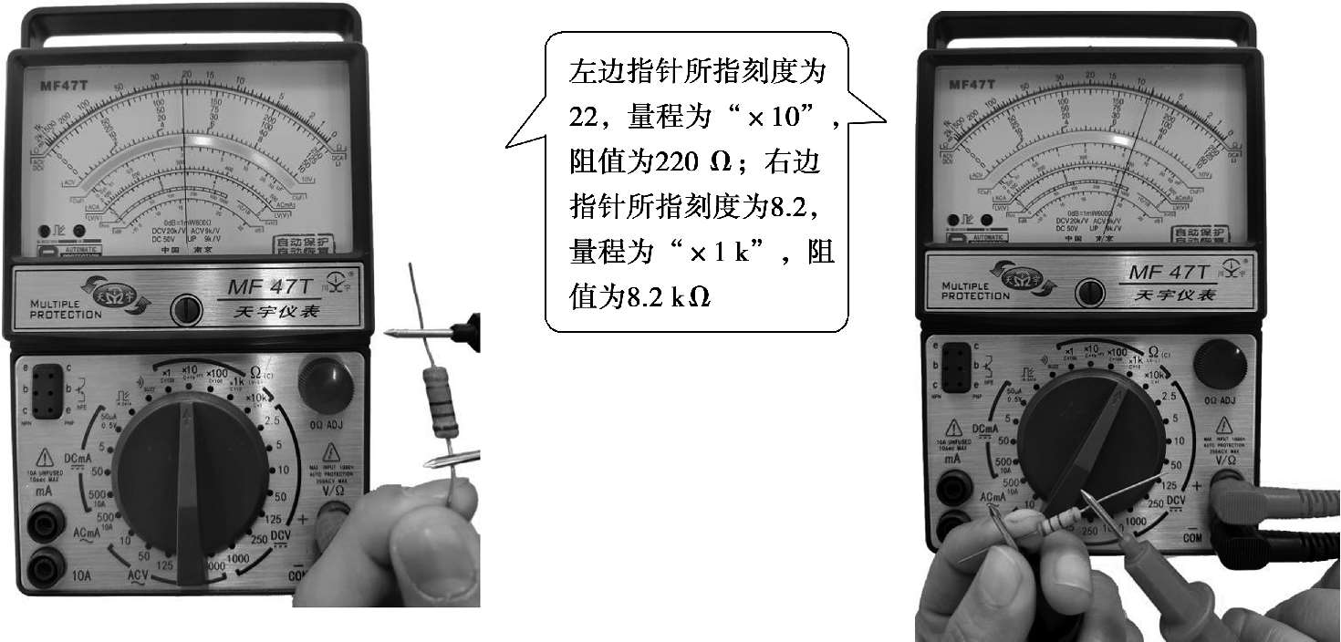 ④读数:指针式万用表根据指针所指的刻度和所选用的量程,测量出电阻的阻值,阻值=刻度×量程,如图1-35所示。数字式万用表可直接读出阻值。