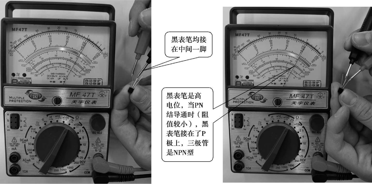 当黑表笔接在基极上,红表笔分别测量其余两只脚的阻值时,如果阻值都小,三极管是NPN型,如果阻值都大,三极管是PNP型,如图1-46所示。