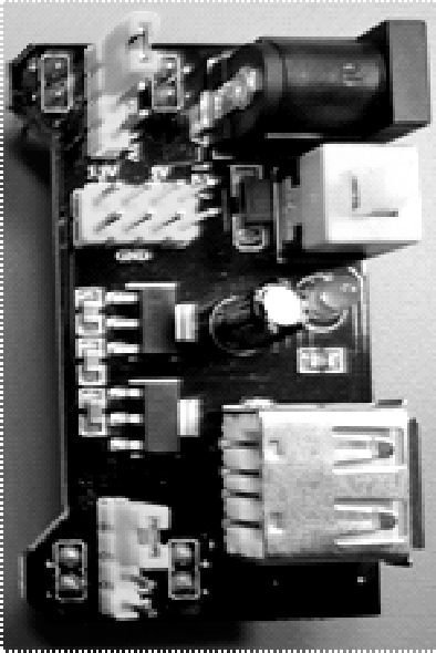 面包板(见图1-47)采用酚醛树脂制造,板底有金属条。在板上对应位置打孔使得元件插入孔中时能够与金属条接触,从而达到导电目的。一般将每5个孔板用一条金属条连接。板子中央一般有一条凹槽,这是针对需要进行集成电路、芯片实验而设计的。板子两侧有两排竖着的插孔,主要用于给板子上的元件提供电源,面包板可采用专门设计的直流电源板(见图1-48)供电。