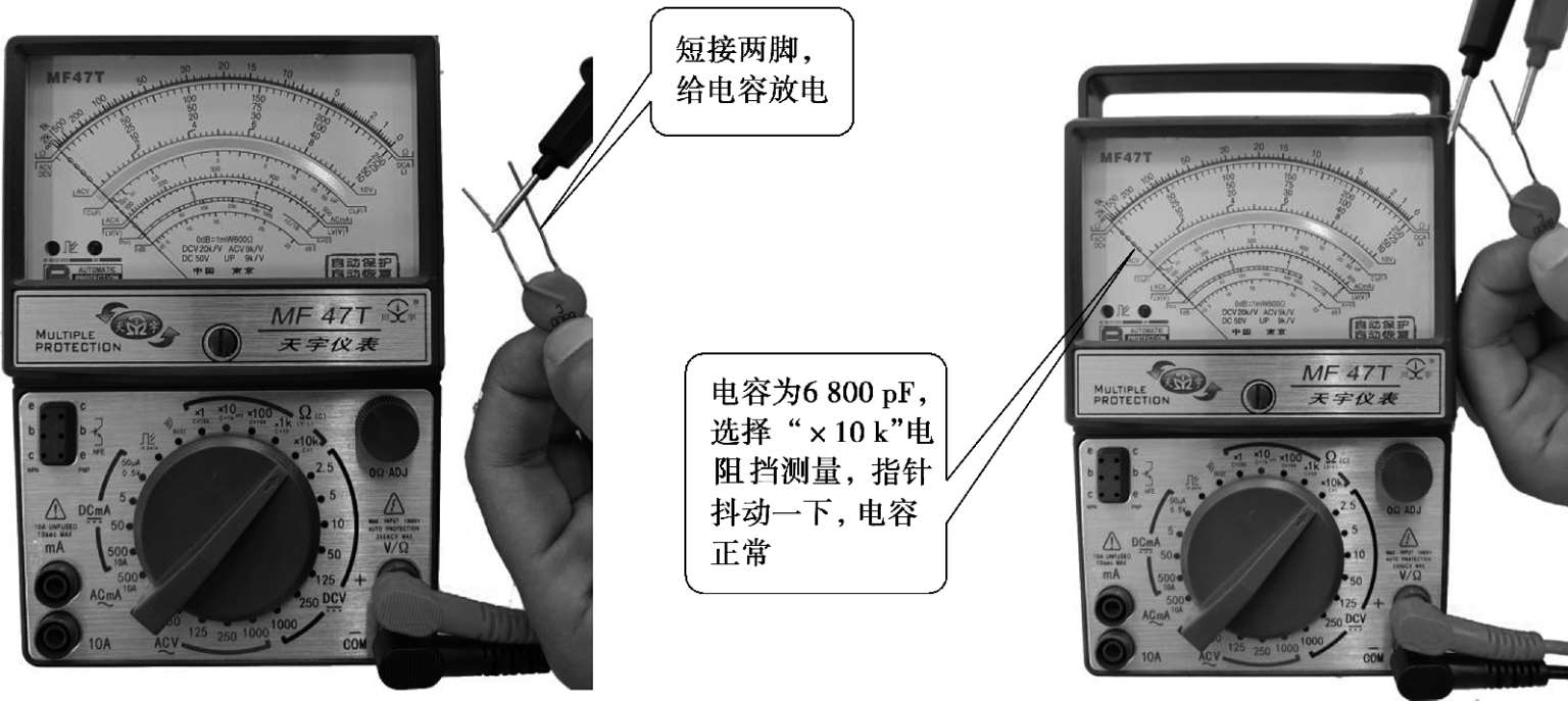 测无极电容时,过程与测量电解电容基本一样,只是不区别红、黑表笔,根据容量选择量程,容量小于几十皮法数量级以下的电容选择“× 10 k”电阻挡进行检测,容量在几千皮法数量级以上的电容选择“× 1 k”电阻挡进行检测。检测时,如果万用表指针首先向右摆动(同一量程,向右偏转角度越大,容量越大),然后又迅速恢复到左边无穷大刻度线,说明电容器是好的,不漏电;如果指针指向右侧的零刻度线,或长时间不回到左边无穷大刻度线,就说明电容漏电或击穿。测试过程如图1-37所示。