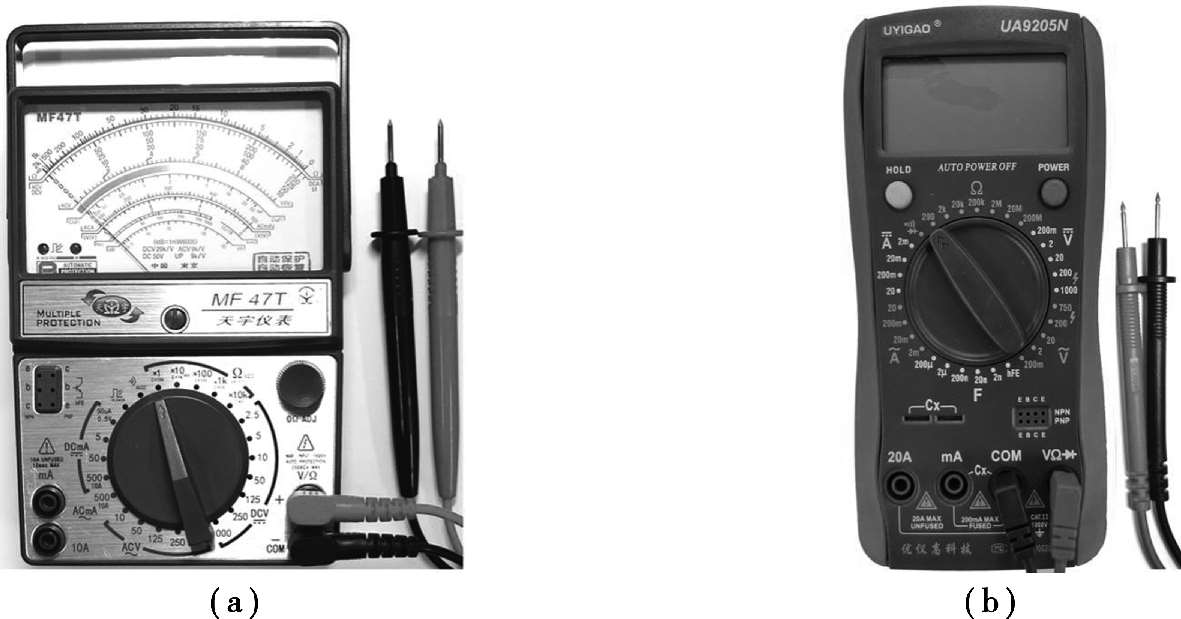 早期的万用表是指针式[也称机械式,见图1-28(a)]的,它使用高灵敏的磁电式直流电流表作为表头,线圈通电后在磁场中受力并带动指针偏转,在刻度盘上指示相应的读数来实现其功能。指针式万用表灵敏度高、反应速度快,但抗电磁干扰能力、抗震能力弱,准确测量电阻值时需要欧姆调零。后来随着科技的发达,数字式万用表[也称电子式万用表,见图1-28(b)]得到普及,数字式万用表测量精度高,读数方便,抗电磁干扰能力强,便于携带,但测试半导体器件性能、元器件漏电时反应速度较慢。