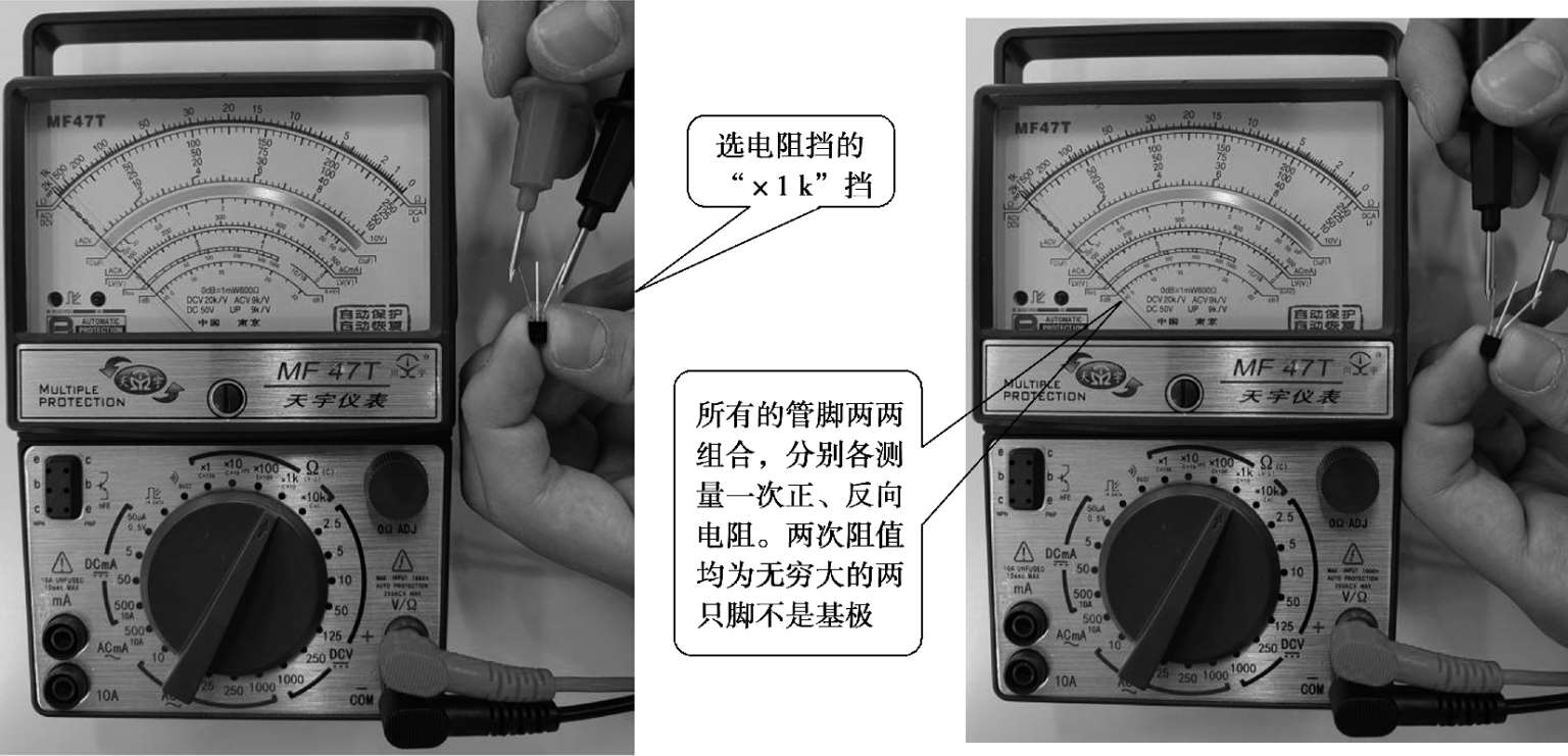 指针式万用表测量三极管时,一般选用万用表电阻挡的“× 1 k”挡进行检测。如果三极管性能完好,正、反向测量两只管脚的阻值,两次测量值均接近无穷大,那剩下的那只管脚一定是基极,如图1-45所示。