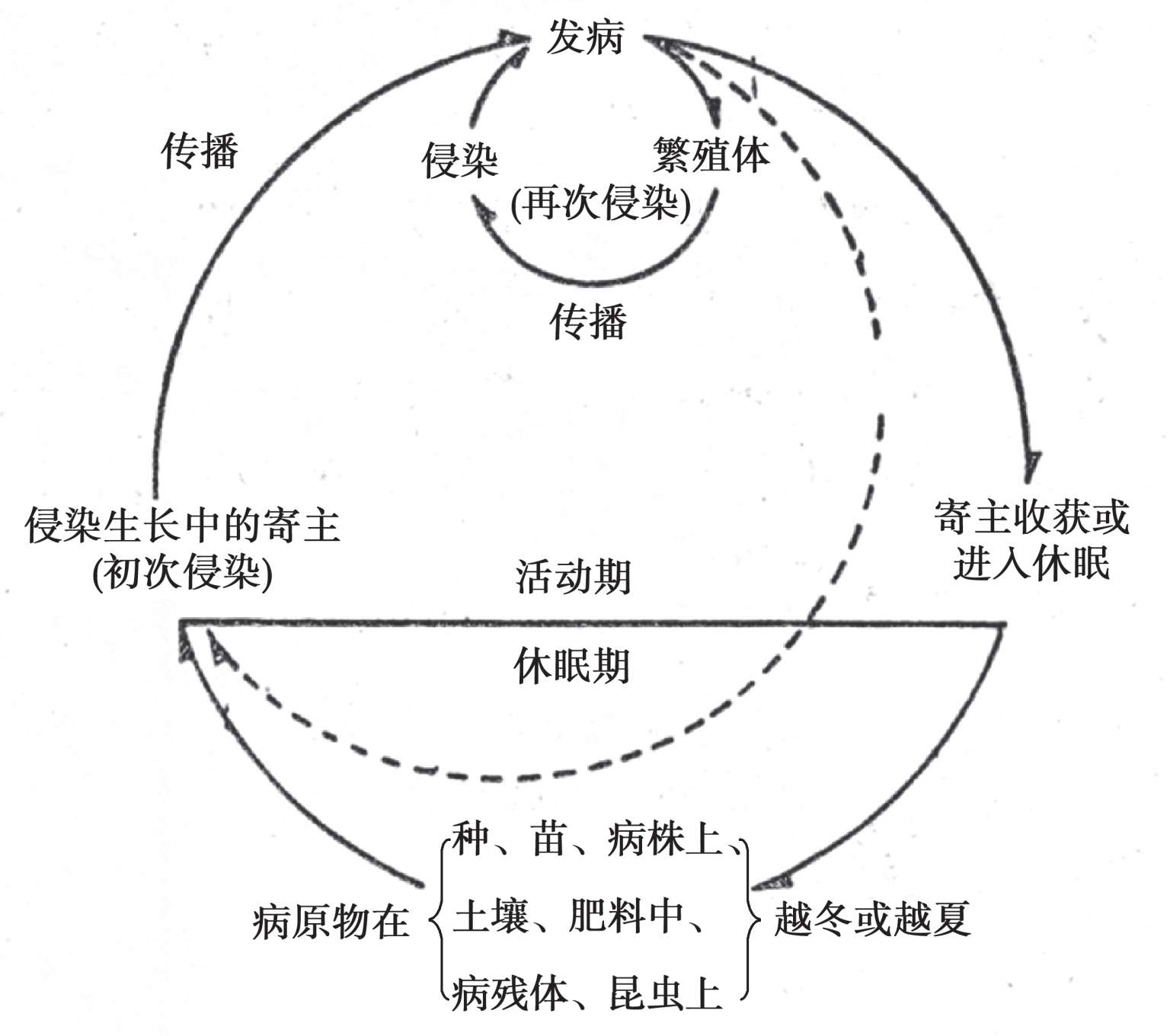 经济林木病害的发展过程包括越冬、接触、侵入、潜育、发病、传播和再侵染等各环节,其中接触、侵入、潜育、发病4个时期是病害一次发生的全过程,称为侵染程序,简称病程。越冬、传播、病程3个环节称为侵染循环(图1-19)。大多数林木病害的侵染循环在一年内完成,即从前一个生长季节发病到下一个生长季节再度发病的全过程。