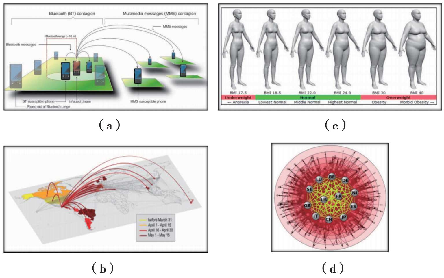 (a)手机病毒传播 [5] ,(b)H1N1 传染病传播 [11] ,(c)肥胖传播 [15] ,(d)金融危机传播 [19]