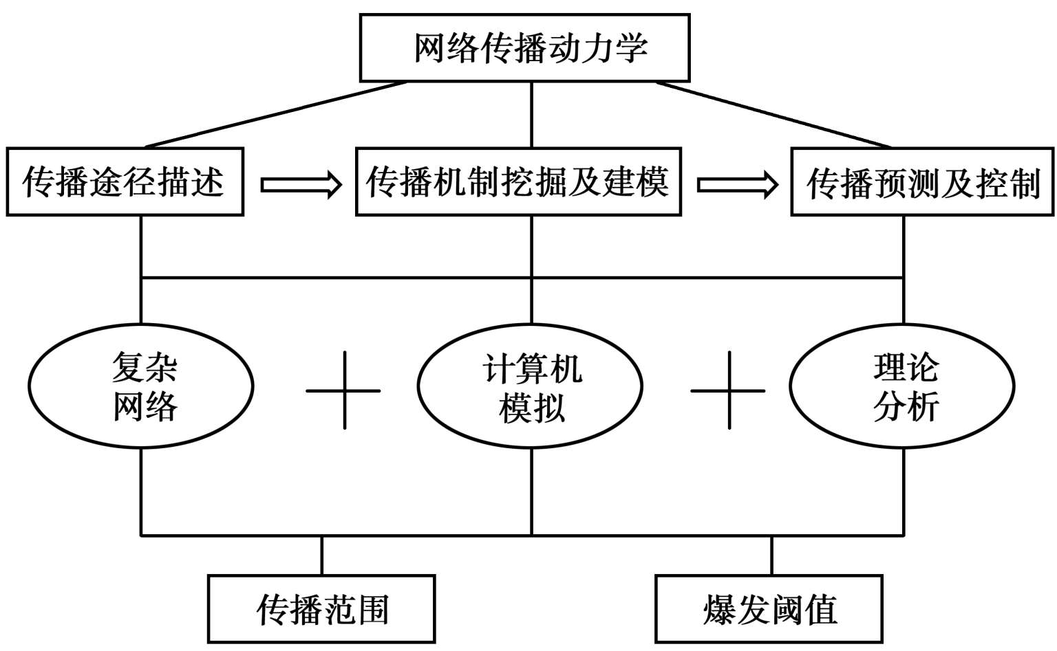复杂网络、计算机模拟和理论分析是研究传播动力学的三个重要工具。传播范围和爆发阈值是研究传播动力学稳态的两个关键指标,可用于定量分析传播途径和传播机制的影响,以及控制策略的效果(图 1-2)。在研究网络传播动力学时,我们应利用不同的研究工具和指标来研究不同的问题。首先,网络传播动力学的研究需要描述错综复杂的传播途径。在描述传播途径时,复杂网络是一个常用的工具 [20] 。利用复杂网络来描述错综复杂的传播途径,进而研究传播动力学,被称为“复杂网络上的传播动力学” [1] 。复杂网络可以刻画诸如因特网、电子邮件网、面对面接触、在线社交平台和各种交易手段等传播途径。用节点描述个体,连边表示个体之间的各种关系。其次,网络传播动力学还需要分析传播机制,并建立真实合理的传播模型。对于不同的传播过程,它们的传播机制和规律也有本质性的差异 [21] 。例如,对于计算机病毒和传染性疾病的传播,两次连续接触导致感染的概率是相同的。然而,行为传播则恰恰相反,即再次接触的感染概率依赖于先前的接触。计算机模拟是揭示不同传播机制,并分析这些机制和网络拓扑结构对传播动力学影响的常见方法。一方面,需要通过网络爬虫获取真实传播数据,利用网络科学理论和数据挖掘技术等手段来得到真实的传播机制;另一方面,由于病毒传播、行为传播或金融风险都会付出惨痛的代价,在得到真实传播机制并建立传播模型之后,人们只能借助计算机来模拟传播过程,并利用恰当的理论分析来定量地研究这些机制所带来的影响。最后,网络传播动力学的终极目标是准确地预测和及时有效地控制传播 [1] 。在网络传播动力学中,控制的含义是指如何采取免疫措施来有效地抑制疾病传播 [22] 。例如,通过免疫中心节点、熟人免疫、高权重边,以及通过信息传递等策略来控制疾病传播。在衡量预测和控制效果时,可以考察传播范围和爆发阈值大小。若传播范围越小、爆发阈值越大,则控制策略越有效。