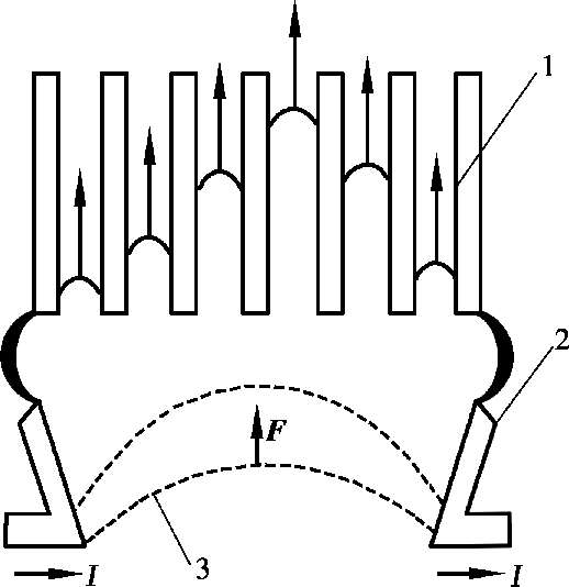 ”“☉”所示。这两个磁场在电弧下方方向相同(叠加),在弧柱上方方向相反(相减),因此,弧柱下方的磁场强于上方的磁场。在下方磁场作用下,电弧受力的方向为力