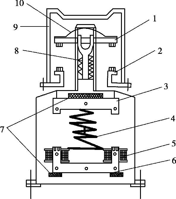 1—动触桥;2—静触点;3—衔铁;4—缓冲弹簧;5—电磁线圈;6—静铁芯;7—垫毡;8—触点弹簧;9—灭弧罩;10—触点压力簧片