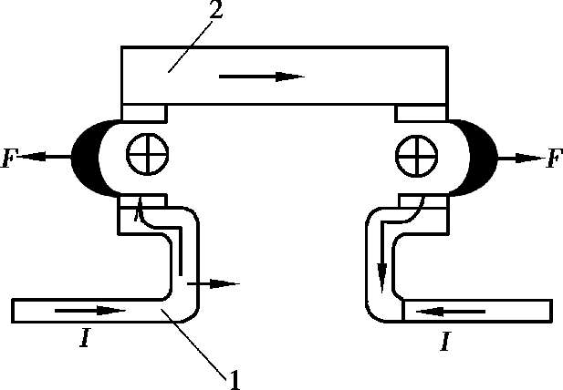 ①电动力吹弧。电动力吹弧示意图如图 1.5 所示,桥式触点在分断时本身具有电动力吹弧功能,不用任何附加装置便可使电弧迅速熄灭。这种灭弧方法多用于小容量交流接触器中。
