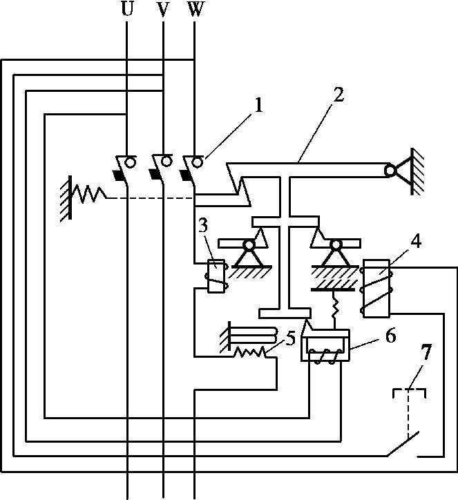1—主触点;2—自由脱扣机构;3—过电流脱扣器;4—分磁脱扣器;5—热脱扣器;6—欠压脱扣器;7—按钮