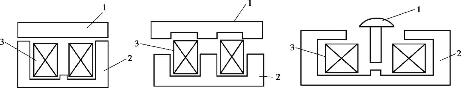 电磁机构由吸引线圈、铁芯和衔铁组成,其结构形式按衔铁的运动方式可分为直动式和拍合式,图 1.2 和图 1.3 分别是直动式和拍合式电磁机构的常用结构形式。图中,吸引线圈的作用是将电能转换为磁能,即产生磁通,衔铁在电磁吸力作用下产生机械位移使铁芯吸合。通入直流电的线圈称为直流线圈,通入交流电的线圈称为交流线圈。