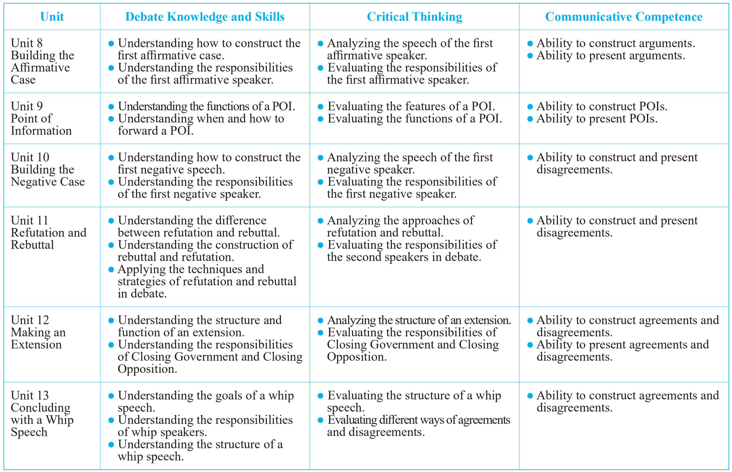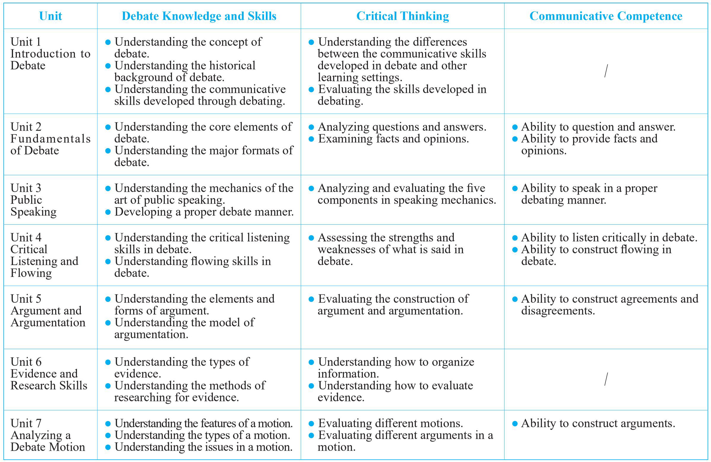 2.“一课一技能”,目标明确,重点突出。单元主题依据辩论环节的顺序设计,每个单元突出一个主题,即一个辩论技能。课前、课中和课后的教学任务均围绕这一主题和技能展开,学生通过反复学习和操练,达到掌握该项辩论技能的目标。