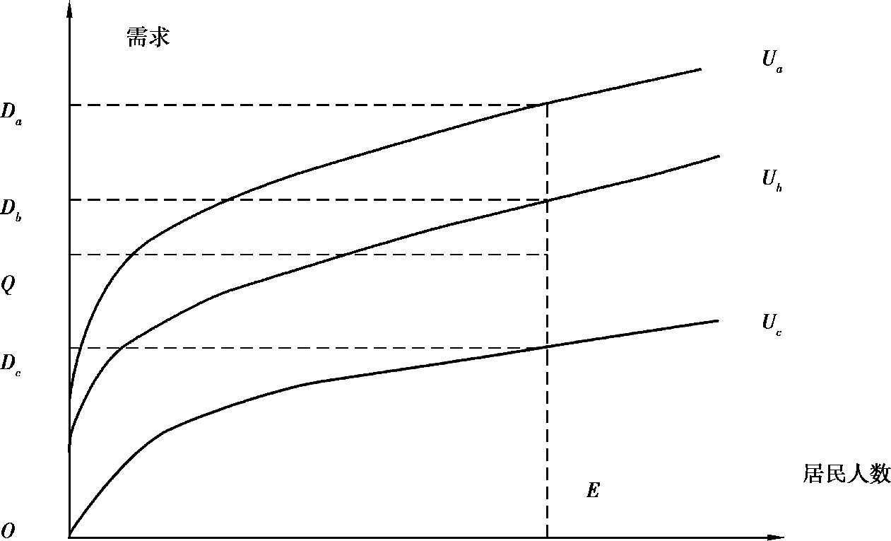 地方政府分散提供地方性公共产品的有效性可以用图 2-3 给以说明。在图 2-3 中,横轴表示辖区居民人数,纵轴表示居民对地方性公共产品的需求。现假设一个国家内部由 A 、 B 、 C 三个地区组成,而且三个地区的居民人数都是 E 。三个地区的居民对地方性公共产品的需求曲线在图中分别用 U a 、 U b 和 U c 表示。由于居民人数都是 E ,此时三个地区的居民对地方性公共产品的需求量就分别为 OD a 、 OD b 、 OD c 。如果由中央政府来统一提供地方性公共产品的话,那么最有可能的提供数量是三个地区居民对地方性公共产品需求量的平均数 OQ 。在图 2-3 中可以看出, Q 点非常接近 D b 点,这说明中央政府提供 OQ 数量的地方性公共产品对 B 地区的居民来说最为满意; Q 点距离 D a 点就比较远,意味着 OQ 数量的地方性公共产品无法满足 A 地区居民的需求。 Q 点又高于 D c 点,表明 OQ 数量的地方性公共产品供给水平超出了 C 地区居民的需求,进而造成了资源的浪费。上述分析是在各地区人口数量相同的假定基础上做出的,而该假定与现实情况还有一定距离。如果再考虑到不同地区居民对地方性公共产品需求在质量方面的差别的话,那么由中央政府提供地方性公共产品与各地区居民偏好之间的差距就会更大。可见,地方政府在分散提供地方性公共产品具有一定的效率优势。