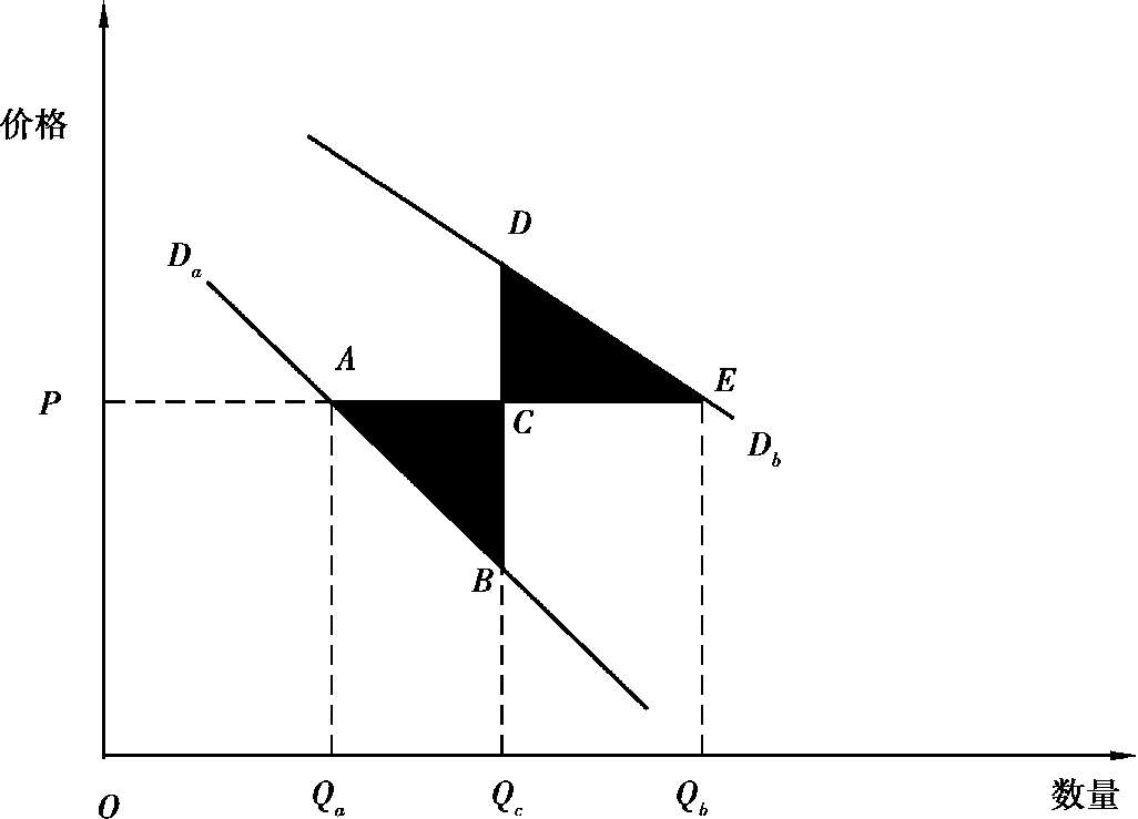 中央政府统一提供地方性公共产品效率损失的大小,与各地区居民消费偏好的差异以及各地区居民对地方性公共产品需求的价格弹性直接相关。各地区居民消费偏好的差异越大,在图 2-2 中体现为 Q a 和 Q b 之间的距离就越大,在其他条件既定的情况下,三角形 ABC 和三角形 CDE 的面积就越大,此时由中央政府统一提供地方性公共产品所产生的效率损失就越大;反之,效率损失就越小。各地区居民对地方性公共产品需求的价格弹性,在图 2-2中体现为甲和乙两地区居民对地方性公共产品需求曲线的陡峭程度。价格弹性越小,在其他因素既定的情况下,三角形 ABC 和 CDE 的面积就越大,此时由中央政府集中提供地方性公共产品的效率损失就越大;反之,效率损失就越小。