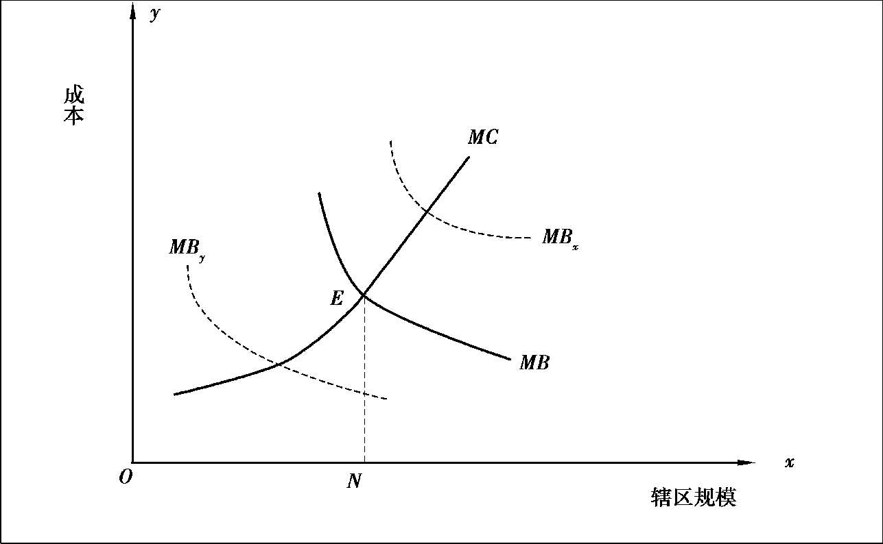 在图 2-4 中, MB 表示因辖区扩大而带来的收益(降低了人均地方性公共产品成本), MC 是因辖区扩大而带来的成本费用, MB x 为受规模经济效应影响的收益, MB y 是受拥挤效应影响的收益。增加的拥挤效应,是指随着辖区扩大和消费者的增加,一定数量的公共产品会给消费者带来相对较少的收益。拥挤效应越大,辖区扩大给居民带来的效益越小。因此,受拥挤效应影响的曲线 MB y 逐渐向下伸展,它会影响曲线 MC 稍微向下伸展,并使其倾斜度逐渐增加。从这个意义上讲,在曲线 MC 一定的条件下,拥挤效应的增加会使辖区 x 的最优规模缩小,即 N 点向左移动。