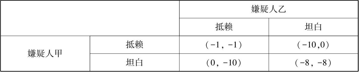 假设甲乙两人的效用是由其被判刑的时间长短来决定,而集体利益是两人刑期时间的总和。甲不知道乙会采取什么样的行动,但他在任何状况下,都可能试图通过坦白策略来改善自己的处境。也就是说,无论乙选择什么策略,甲的策略都应该是坦白。从表 2-1 可以看出,假如乙抵赖,如果甲也抵赖,那么甲将被判刑 1 年;但如果甲坦白,那么甲会被立即释放。假如乙坦白,那么甲也只能选择坦白,因为坦白只会被关 8 年,而抵赖的刑期则是 10 年。同理,乙在任何情况下也会选择坦白。表 2-1 中的(-8,-8)就是占优策略。