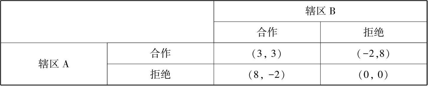 囚徒困境模型是社会个体成员由个人理性出发而未能达成集体理性的典型事例。囚徒困境可作为分析地区利益矛盾和地区政策的基本工具。假设存在一个由辖区A和辖区B共同组成的社会,每个辖区都提供公共产品。假如公共产品的单位生产成本为 10 元,公共产品被提供出来后,两个辖区各能获得 8 元的利益。如果辖区A和B都有合作或拒绝两种选择,即合作提供公共产品或者拒绝生产公共产品,则可得地方性公共产品提供的囚徒困境博弈的支付,如表 2-2 所示。