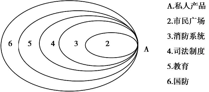 就火灾的预防和控制而言,与之相关的消防系统的受益范围就要更大一些。例如A市的消防系统可以使城市内所有市民都能从中受益,而与之相邻的B市市民能够从A市消防系统内获得的收益有限,而相邻省份的C市市民能从A市消防系统获得的收益可能微乎其微。由此可见,消防系统的受益范围基本限于该城市行政区域之内,如图 2-1 中的圆圈 3 所示。国防是典型的全国性公共产品,国防被提供出来后,全国范围的所有居民都可以无差别地从中受益,国防的受益范围就是该国的所有疆域,如图 2-1 中的圆圈 6 所示。