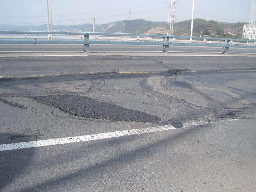 钢箱梁具有抗弯刚度大、抗扭性能好、自重轻、跨越能力强等优点,20 世纪50 年代以来一直是钢结构桥梁的主要截面形式。钢箱梁一般采用正交异性钢桥面板,其自重约为钢筋混凝土桥面板或预制预应力混凝土桥面板自重的1 /3~1 /2,而且其运输架设方便、施工周期短,自1940 年以来已成为钢箱梁桥的首选桥面形式。正交异性钢桥面板由纵横向互相垂直的加劲肋(或横隔板)连同桥面盖板组成,既是钢箱梁的上翼缘,又直接承受车辆的轮载作用。公路车辆运行轨迹及质量的不确定性,使得正交异性桥面板的变形特点、应力分布十分复杂。铺设于钢桥面板上的桥面铺装虽然不参与结构受力,但其质量和性能直接影响行车的安全性和舒适性。受正交异性桥面板的刚度特性和变形特性及行车荷载、温度变化等因素的综合影响,其受力和变形远较道路路面或机场道面复杂。统计表明,钢桥面铺装是我国钢桥的多发病害形式之一,有的桥梁投入使用后不到两年,桥面铺装即出现开裂、鼓包、坑洞、车辙等病害(图1.1、图1.2),整体上钢桥面的沥青混凝土铺装的使用年限不到设计使用年限的1 /3,已有桥梁在10 年间多次更换桥面铺装仍不能解决问题。桥面铺装的维修已成为钢箱梁桥运营维护成本的重要组成部分,高昂的桥面铺装维修费用成为阻碍钢结构桥梁快速发展的障碍之一。