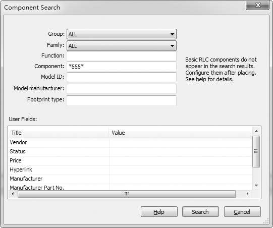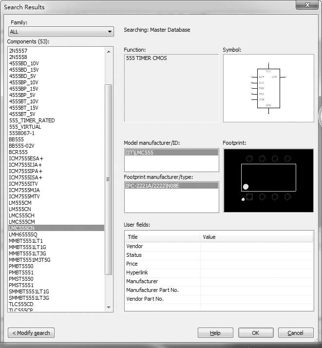 如果知道某种元件的型号,却不知道它在哪个元件库中,可以利用元件搜索功能来查找。单击图1.3.3中的“Search(搜索)”,即可搜索元件。如果使用搜索功能时不知道准确的元件名,可以使用模糊匹配的方法,在元件前后加入通配符“∗”,如需要查找定时器555,则在“Component”中输入“∗555∗”,如图1.3.3所示,再单击“Search”,在查找出的结果中根据功能描述“555 TIMER…”即可找到所需要的555时基电路,如图1.3.4所示。