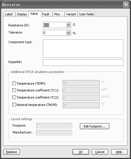 元器件的属性对话框具有多种选项可供设置,包括Label(标识)、Display(显示)、Value(数值)、Fault(故障设置)、Pins(引脚端)、Variant(变量)等内容。电阻的属性对话框如图1.3.2所示。