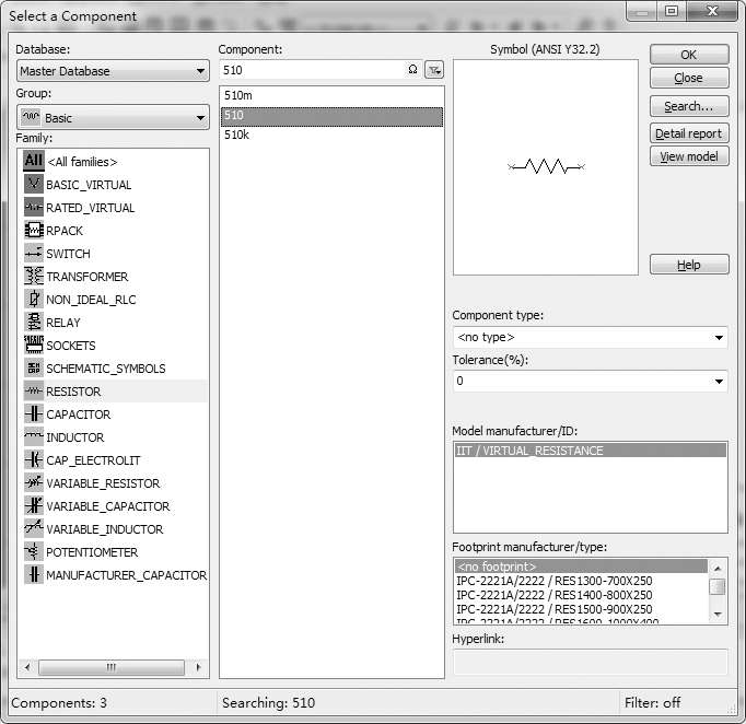 选用元器件时,首先在元器件库栏中用鼠标单击包含该元器件的图标,打开该元器件库。然后在选中的元器件库对话框中(如图1.3.1所示电阻库对话框)用鼠标单击该元器件,然后点击“OK”,再用鼠标拖拽该元器件到电路工作区的适当地方即可。