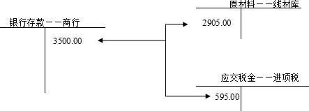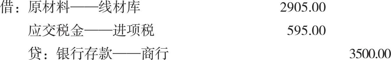 例如:公司采购员王明5月29日购回漆包线50kg,含税价70元/kg,货已入库验收,货款已从商行支付。会计分录: