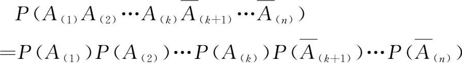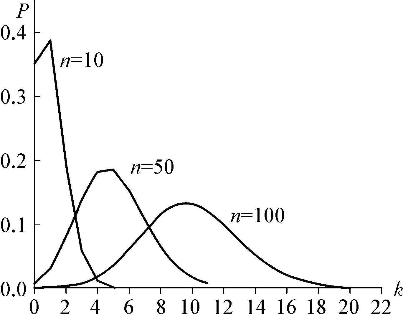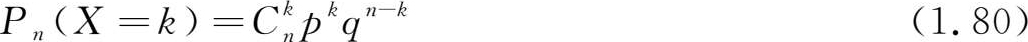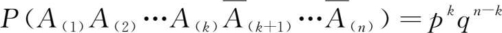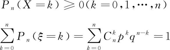 二项分布 (binomial distribution)来源于重复独立试验。将某一试验重复 n 次,若各次试验的结果互不影响,即每次试验结果出现的概率都不依赖于其他各次试验的结果,则称这 n 次试验是独立的。重复试验中最简单的是伯努利试验(Bernoulli trials),它可以描述为每次试验只有两个可能的结果 A 及 A , A 出现的概率为 p , A 出现的概率为 q =1- p 。假设重复进行 n 次试验,考虑 A 在 n 次试验中出现的次数 X 。显然,它是一个能取0,1,2,…, n 等整数值的离散型随机变量。下面讨论 X 的概率分布。先计算在 n 次试验中 A 出现 k 次的概率 P n ( k )。
