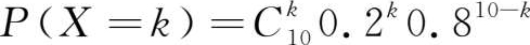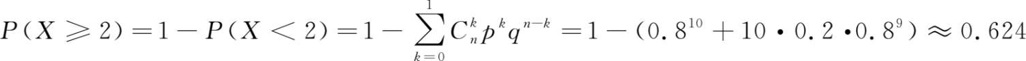 例 1.7 :某天文站进行人卫激光观测,设每次射击的命中率是0.2,独立观测10次,试求击中卫星的次数大于等于2的概率。