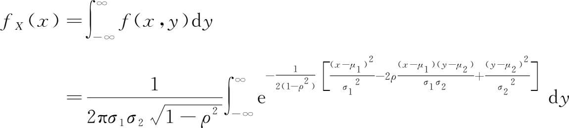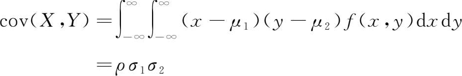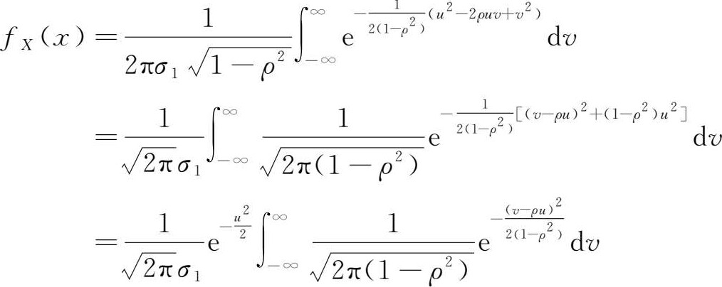 它们表明,二维正态分布的每一边缘分布都是服从正态分布的,并且都不依赖参数 ρ 。此外,不难证明 μ 1 , μ 2 和 σ 1 2 , σ 2 2 就是正态变量 X , Y 的数学期望和方差,还可以证明 X , Y 的协方差为