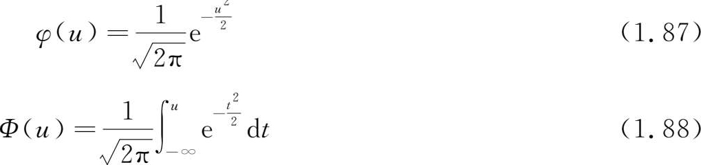 当 μ =0, σ 2 =1时,称 X 服从 标准正态分布 (standard normal distribution),记为 X ~ N (0,1)。其概率密度和分布函数分别为