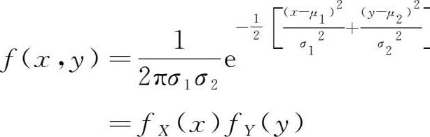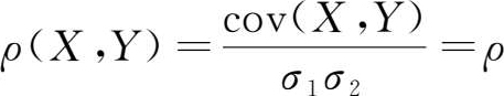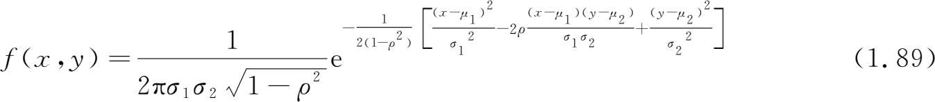 这就是说,二维正态分布概率密度中的参数 ρ 就是这两个正态变量的相关系数。在上一节相关系数的第3个性质中已经指出,若两个随机变量相互独立,则相关系数等于0,但反之并不成立,而对于两个正态变量,如果它们不相关,即 ρ =0,由(1.89)式有