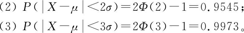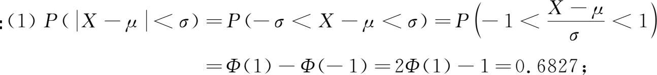 此例给出了正态变量 X 在期望值左右一倍、两倍和三倍标准误差范围内的概率含量。在实际数据处理中,还经常使用“2.6 σ 原则”,即测量误差在2.6倍均方差范围内的概率约为99%。