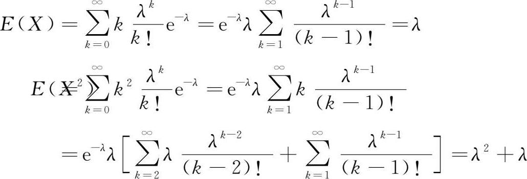 而 D ( X )= E ( X 2 )- E ( X ) 2 = λ 2 + λ - λ 2 = λ ,得证。