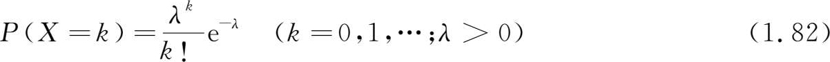 由(1.82)式,利用数学期望和方差的定义不难得到泊松分布随机变量的数学期望和方差,它们分别为 E ( X )= λ 和 D ( X )= λ 。