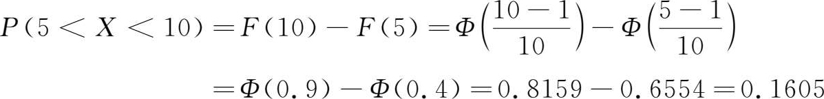 例 1.8 :已知 X ~ N (1,10 2 ),求 P ( X >12)及 P (5< X <10)。