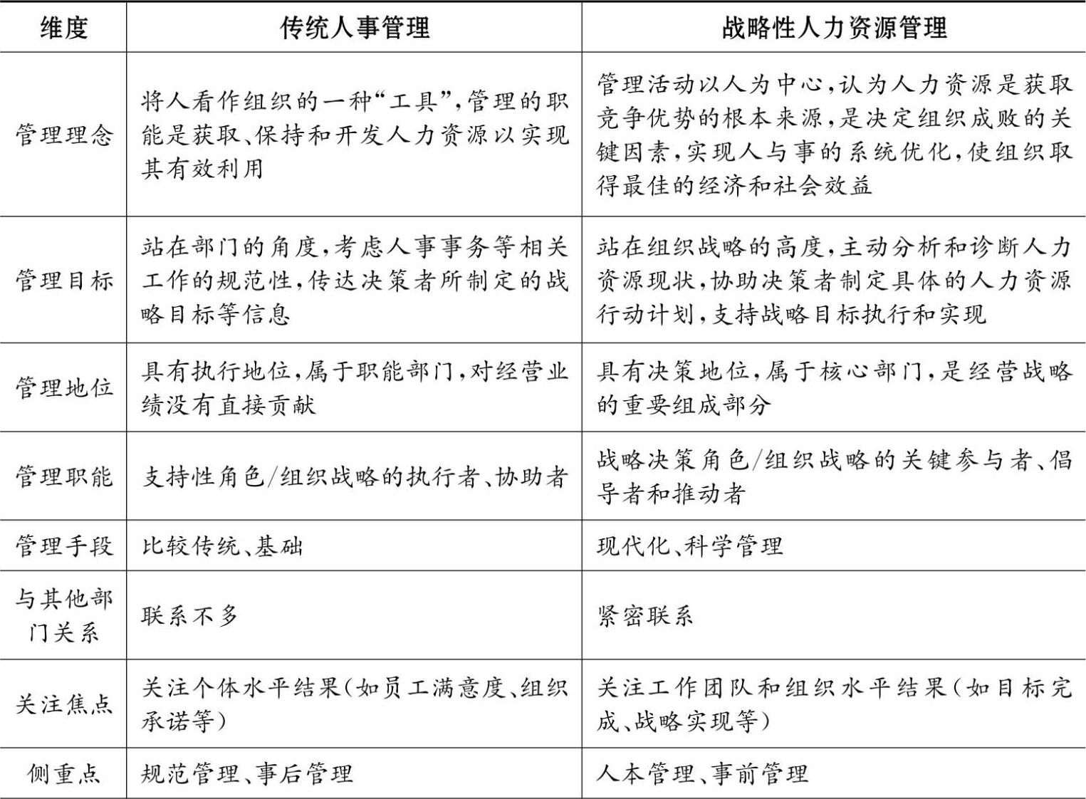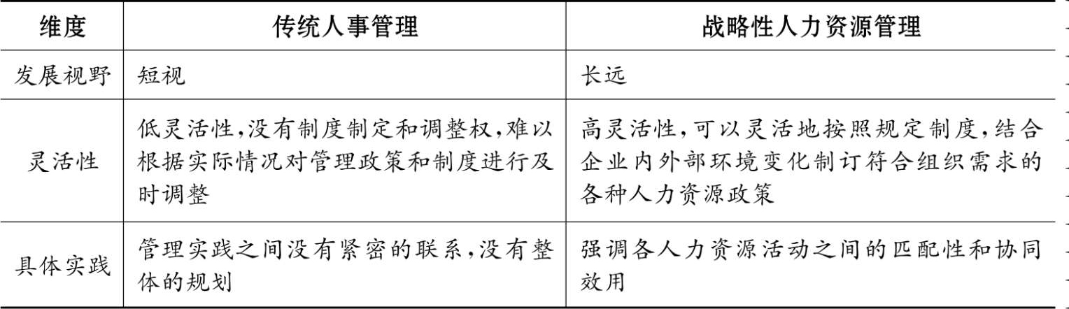 战略性人力资源管理是组织为达到战略目标,系统地对人力资源各种部署和活动进行计划和管理的模式,是组织战略不可或缺的有机组成部分。传统人事管理是为完成组织任务,对组织中涉及人与事的关系进行专门化管理,使人与事达到良好的匹配。虽然传统人事管理和战略性人力资源管理都是对人的管理,但是两者在很多方面具有明显的区别(见表2-1):