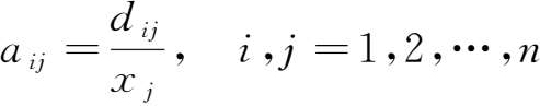 在投入产出表3-1中,中间产品流量 d ij 是 j 产品部门生产 x j 单位时所投入的 i 产品部门的产品量,这只是反映一个具体的生产技术结构,我们无法在表中直接找到,当 j 产品部门的生产量改变后所需要投入的各产品部门的产品量。现在我们大胆假定 d ij 和 x j 之间存在齐次线性关系,因此定义了中间产品的投入系数(也称直接消耗系数)。