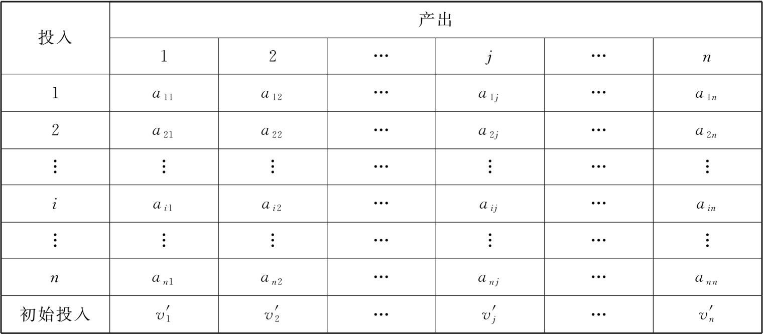 由此我们可以得到投入系数表(见表3-2),它体现了投入产出模型中生产结构的基本特征,是广义的投入产出表(投入产出表、投入系数表和后面将要说明的投入产出逆系数表)的三个组成部分之一。