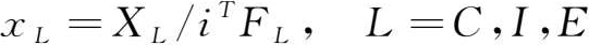 式中, x C , x I , x E 分别表示最终消费、资本形成、出口的生产诱发系数向量; i T =(1,1,…,1)为 n 维向量, T 表示向量转置, i 为分量均为1的 n 维列向量。