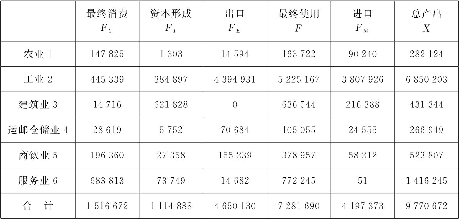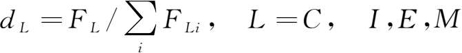 式中, d C , d I , d E , d M 分别表示最终消费、资本形成、出口、进口产品结构系数向量; F C , F I , F E , F M 分别表示最终消费、资本形成、出口、进口产品向量; F Ci , F Ii , F Ei , F Mi 分别表示第 i 部门的最终消费、资本形成、出口、进口产品数量。最终需求的产品结构系数表示的是某种最终使用产品占最终使用总量的比例。